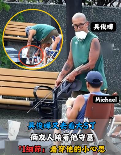 據悉,其中一位陪同的人是具俊曄的「大哥」Michael,他長期給予具俊曄精神上的支持,在具俊曄的陪同下前往金寶山。三人在大S墓地前閑聊,只不過Michael無法做到感同身受,坐在墓前翹著二郎腿,與愁眉不展的具俊曄完全是兩種狀態。
