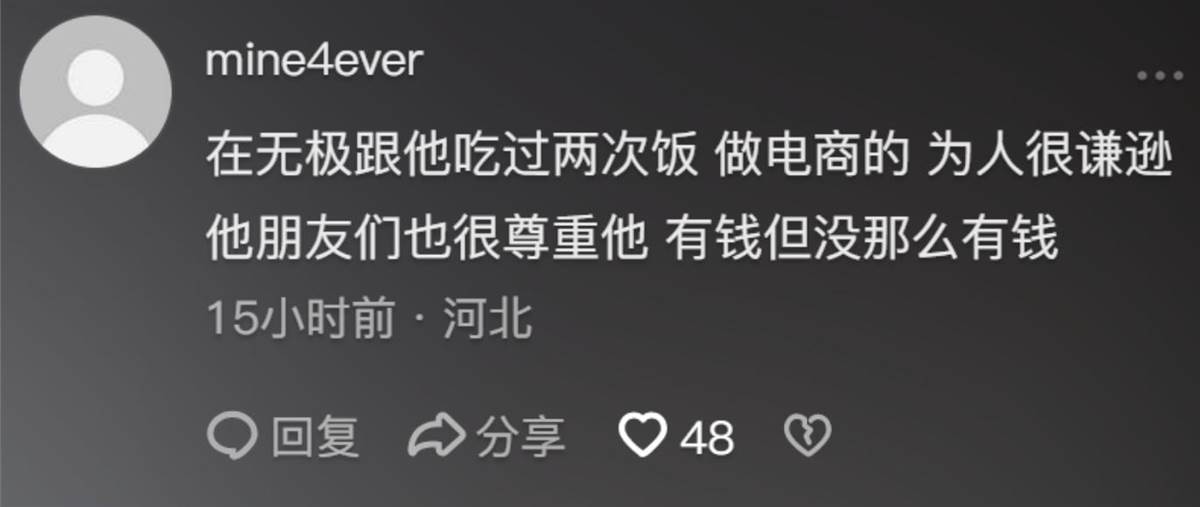 這個男生是比較有錢的,有網友說男生家裡是開工廠的,他自己做電商,雖然比不了富翁,但也挺會賺錢的。