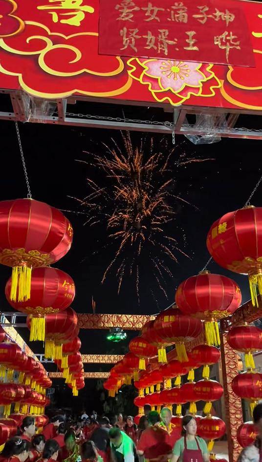 白天婚禮儀式結束了,傍晚又在家裡開了一場宴席,他們還放了一場煙火,在絢爛煙火下,賓客們的臉上也洋溢著開心的笑容。