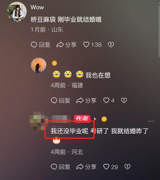 不久之後她就和男生登記了,她還沒畢業就嫁給了愛情,難怪他們都說已經離不開彼此,從兩小無猜走到現在,已經勝似親人了。