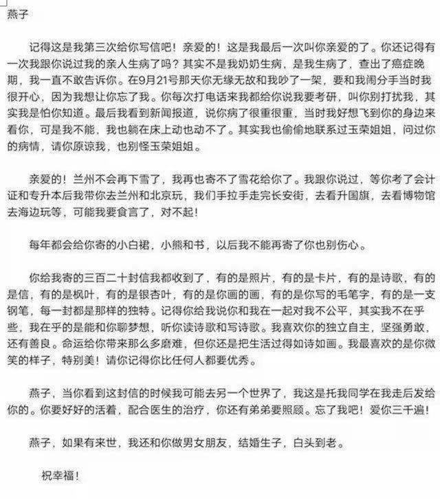 原來這封信是男友小凌寫下的,看到這封信的時候,小凌已經因為癌癥晚期離開了人世,在同學的幫助下送到了吳花燕的手里。