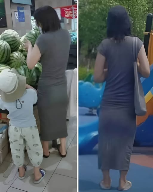 照片拍攝於一間超市和一處遊樂場中,婦女正忙於挑選西瓜和照看孩子。