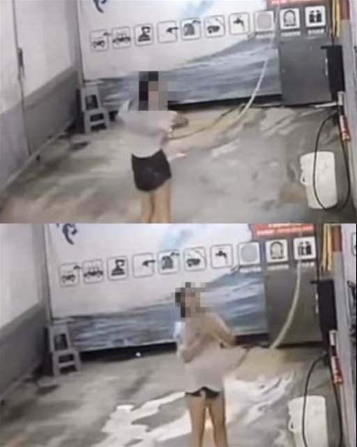 有網友在FB社團《爆廢公社二館》PO出一則影片,一名穿著白色上衣及超短真理褲的女子,光著腳丫在自助洗車場拿著水管就往身上淋,