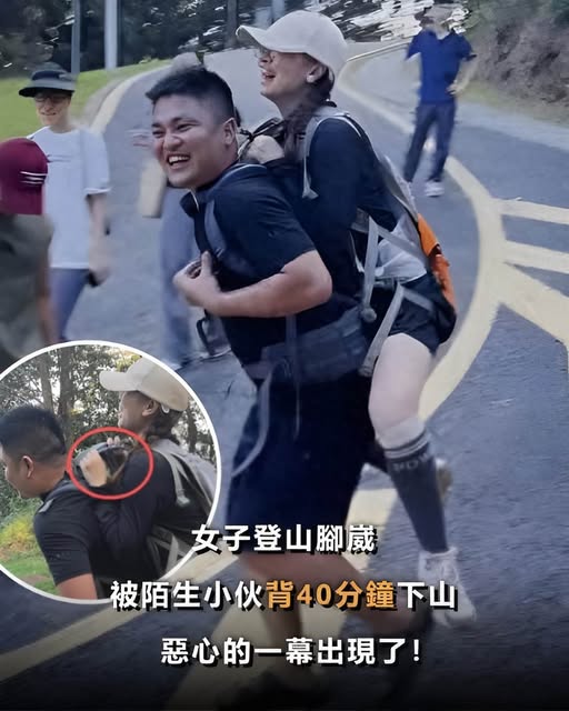 廣州市某山路上,一名女子崴腳無法下山,一位陌生男子穿著拖鞋徒步將她背下三公里山路,全程用時40分鐘。
