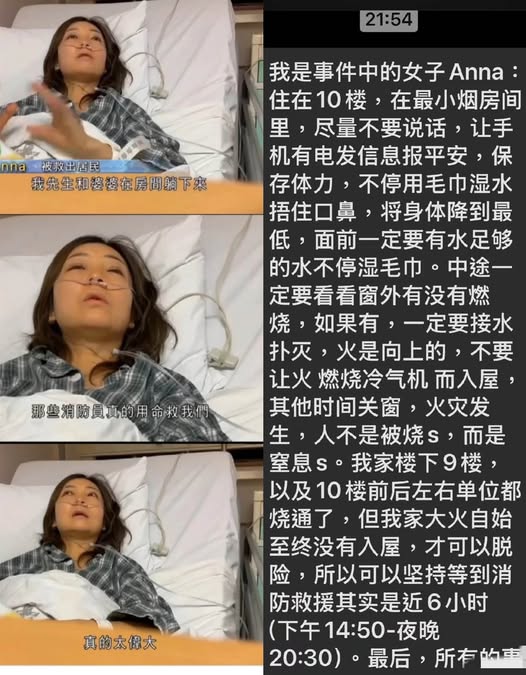 在香港一場致命大火中,一位名叫安娜的女士憑藉寂靜判斷和自救知識,在濃煙烈火中堅持六小時後獲救。