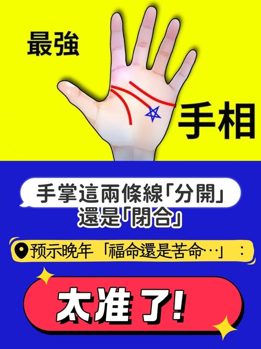 ​​晚年福氣:​​ 正因為早年的獨立自主和理性規劃,這類人被認為在晚年更容易積累財富、保持健康,享受相對安逸、有福氣的晚年生活,是為「福命」。手掌這兩條線「分開」還是「閉合」,預示晚年「福命還是苦命」:太準了!