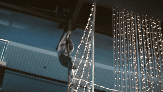 從商場吊燈滑下,玻璃碎片飛濺中,眼神凌厲,神氣十足。