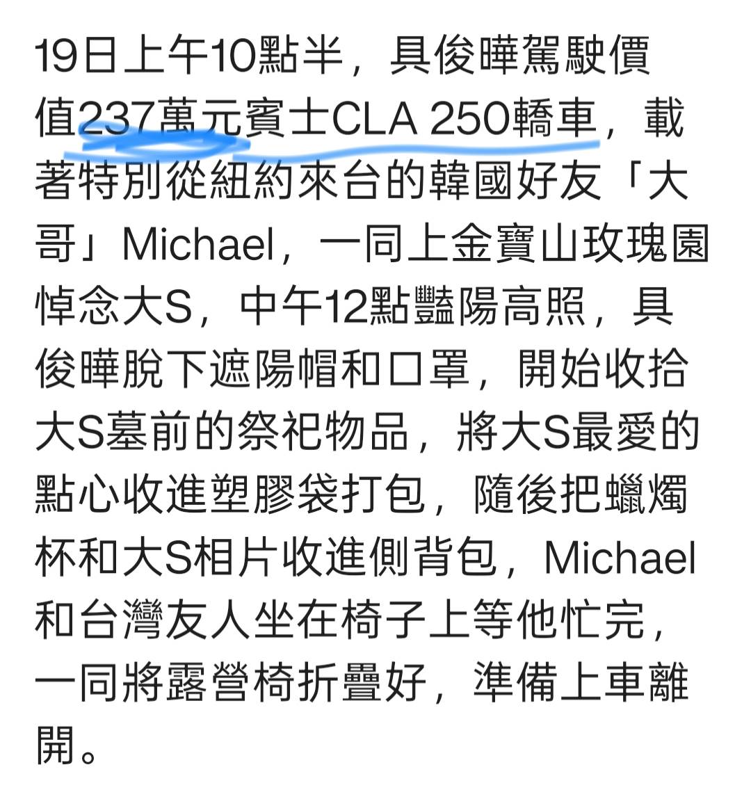 買新車不稀奇,稀奇的是具俊曄的這部新車的型號是奔馳CLA250,一輛檔次很普通的緊湊型C級家用車,在內地的落地價大約在30萬至60萬之間,台媒報道標注了台北的價格是237萬台幣,折合人民幣僅僅55萬。