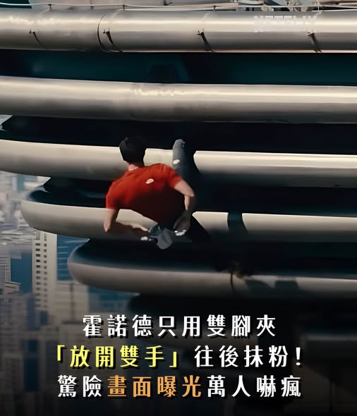 霍諾德在攀爬多層圓柱體時,讓無數觀眾心臟快跳出來,霍諾德雙手放開,僅靠雙腳夾住建築物,下一秒雙手往身後的袋子裡抹粉。