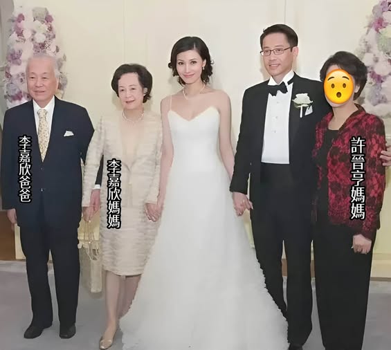 許晉亨的雙親對于李嘉欣成為家中一員的態度,一直以來都頗為保留。在那個特殊的日子里,當新郎新娘與雙方父母站在一起合影時,