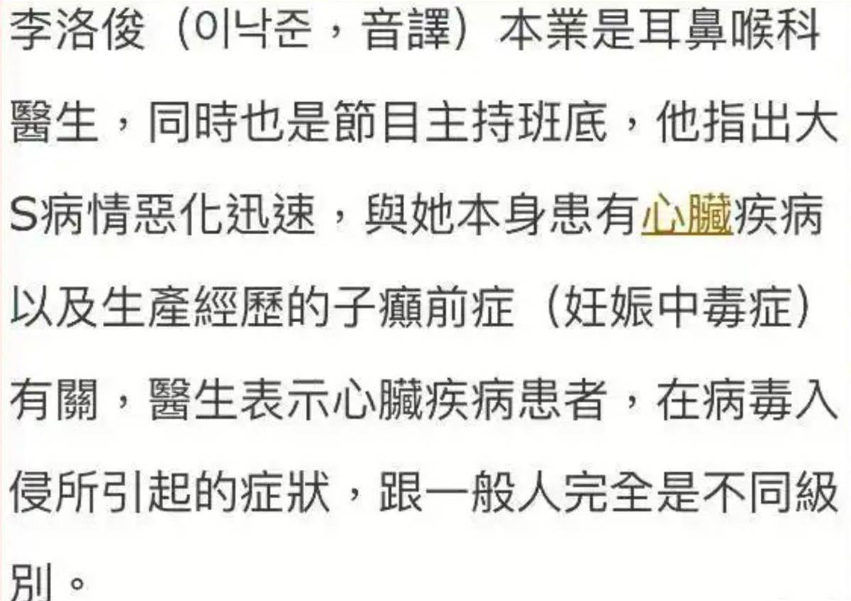 另外這檔節目在韓國播出之後,有不少當地的醫生也做出推測,比如韓國的一位耳鼻喉科醫生表示,大S之所以會猝死,可能跟她本身患有心臟病,以及之前的二胎生產經歷的子癲前癥有關,這些癥狀都有可能讓大S的心臟嚴重受損,加重病毒入侵的癥狀,甚至引發心臟驟停