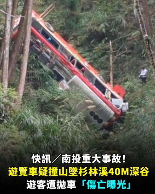 南投縣竹山鎮杉林溪森林遊樂區今(9)日12時15分發生一起重大事故,一輛巴士不明原因,連人帶車墜落約30、40公尺深的山谷,導致車上10幾名司機、乘客受困,現階段據了解,至少有9人受傷,