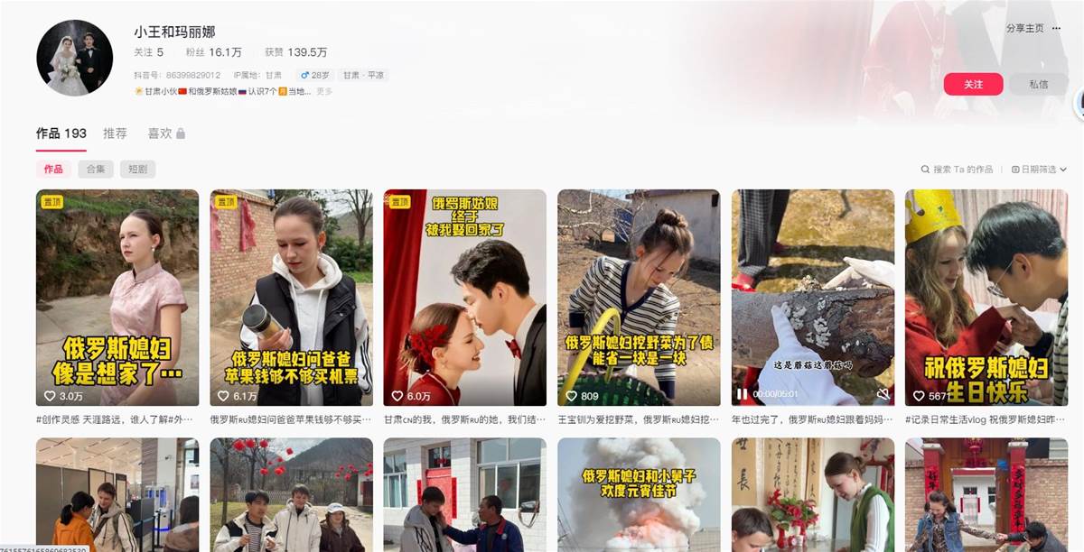 而王文傑也建立了一個名為「小王和瑪麗娜」的抖音賬號,他也在抖音上分享了自己結婚的影片,當網友們看到本尊以後,紛紛關注了王文傑的抖音號。