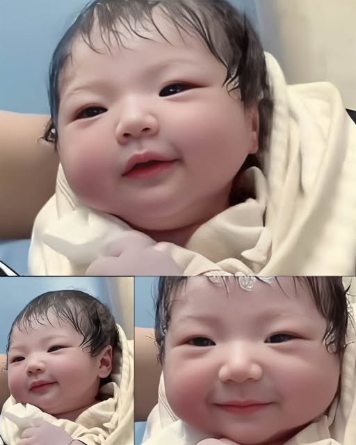 鏡頭裡,那個小小的生命如此安靜。他有著濃密的、略顯溼潤的黑髮,軟軟地貼在額前。他的小臉粉嫩,眼睛閉著,長長的睫毛在眼瞼下投出淡淡的陰影。然後,就在父母屏息凝視的瞬間,他的嘴角似乎輕輕向上牽動了一下,勾勒出一個極其微弱、卻無比清晰的、類似微笑的弧度。