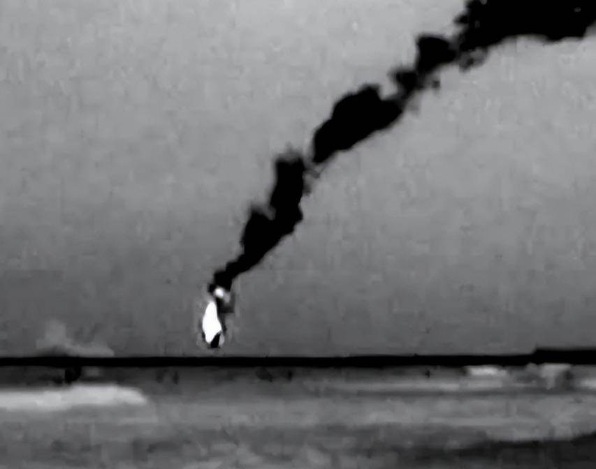 最終「砰」地一聲,在基勞亞火山附近海面不幸墜毀,海面冒起濃濃的黑煙。