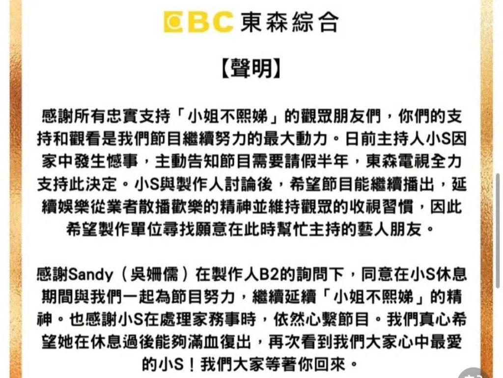 小S主持的節目《小姐不熙娣》節目組發聲明,小S請假半年,今後會繼續做節目。