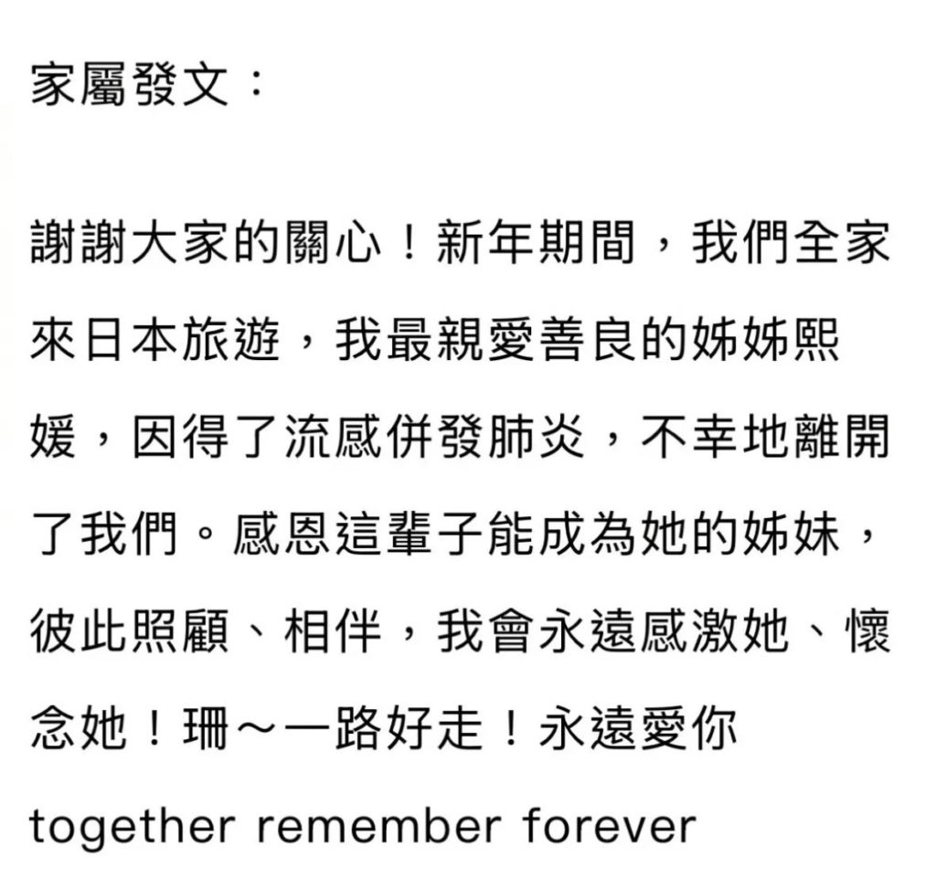 大S(徐熙媛)在日本猝逝,享年48歲。小S今透過經紀人證實:「謝謝大家的關心!新年期間,我們全家來日本旅遊,我最親愛善良的姊姊熙媛,因得了流感併發肺炎,不幸地離開了我們。感恩這輩子能成為她的姊妹,彼此照顧、相伴,我會永遠感激她、懷念她!珊~一路好走!永遠愛你 together remember forever」