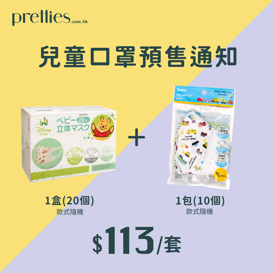 Pretties.com.hk 表示,將發售Skater 兒童口罩1盒(20個) (1-3歲適用)+1包(10個)(4歲以上適用) ,套裝以$113超抵價發售,款式則隨機發貨,店主指這批是最後一批兒童口罩。
