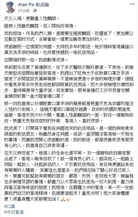 旅行時會見口罩便入貨,但會否為内地家人搶購物資?她說:「我哋都搶得好犀利。」湯洛雯見網上傳聞100元一包口罩,十分誇張,就算叫外賣也有風險,她笑言不知道可吃甚麼。