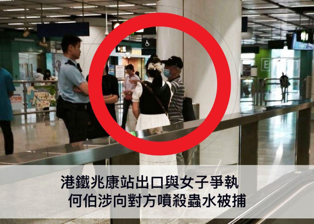 (25日)3時11分,因公開父女金錢紛爭及「黃昏戀」成為城中熱話的何伯(77歲),在屯門港鐵兆康站E出入口,因瑣事與一名姓霍(41歲)女子發生爭執。期間,何伯取出一支殺蟲水噴向霍女,導致其手部受傷。警員接報到場經調查後,以涉嫌「意圖損害等而施用毒藥等」罪拘捕何伯,女事主則送院治療。