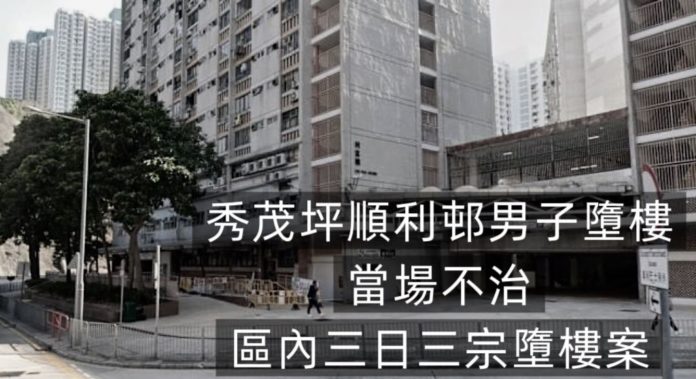 秀茂坪順利村今日(4日)有人墮樓。一名年約60歲男子於早上約10點半於秀茂坪順利邨利康樓從高處墮下,倒臥地面。警方及救援員接報到場後經檢驗後,證實男子當場不治。警方正在調查其身分及墮樓原因。
